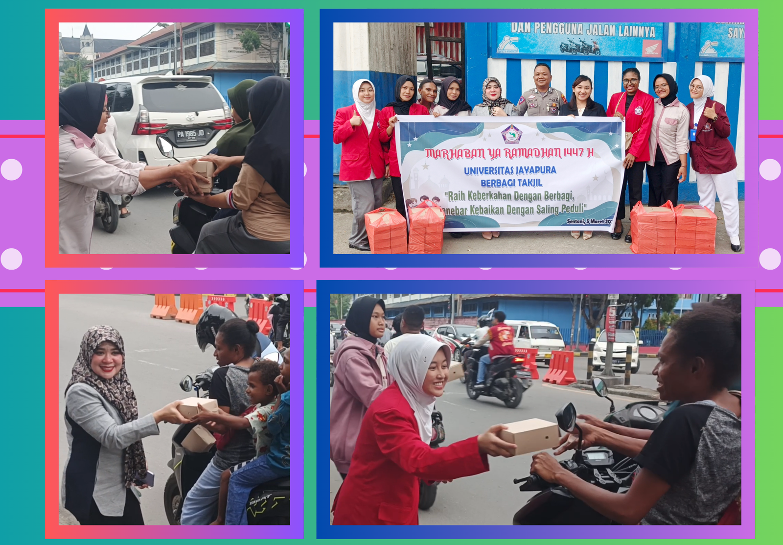 Sentani, 5 Maret 2026 — Dalam semangat kebersamaan di bulan suci Ramadan, mahasiswa dan dosen Universitas Jayapura menggelar kegiatan berbagi takjil kepada masyarakat di kawasan Lampu Merah Bandara Sentani pada Rabu (5/3). Kegiatan ini dilaksanakan sebagai bentuk kepedulian sosial sekaligus mempererat hubungan antara civitas akademika dan masyarakat sekitar. Sejak sore hari,