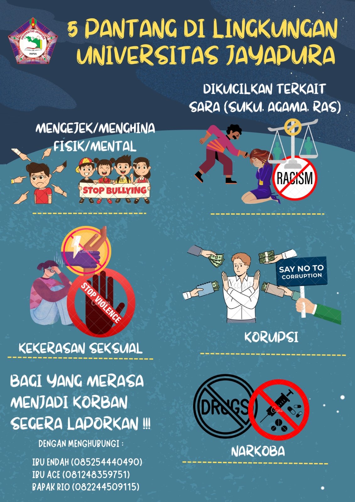 Dalam rangka menciptakan lingkungan kampus yang aman, nyaman, dan saling menghargai, seluruh civitas akademika Universitas Jayapura diharapkan untuk memperhatikan dan mematuhi hal-hal berikut yang dilarang dilakukan di lingkungan kampus, yaitu: Mengejek atau menghina fisik maupun mental (bullying) terhadap sesama mahasiswa maupun warga kampus. Melakukan tindakan yang berkaitan dengan SARA (Suku, Agama, dan