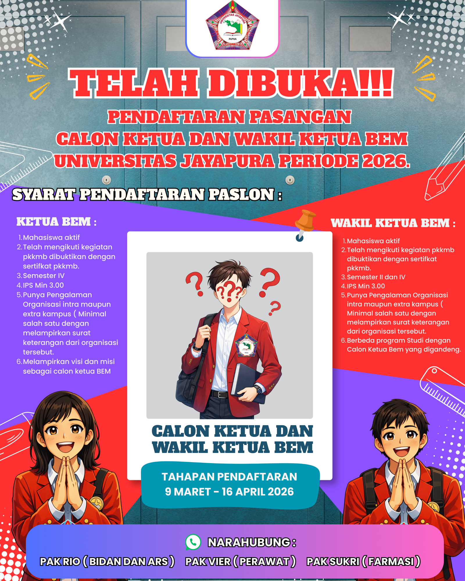 Bagi mahasiswa yang memiliki jiwa kepemimpinan, pengalaman organisasi, dan ingin berkontribusi untuk kemajuan kampus, ini adalah kesempatan Anda untuk mencalonkan diri sebagai Ketua dan Wakil Ketua BEM Universitas Jayapura.